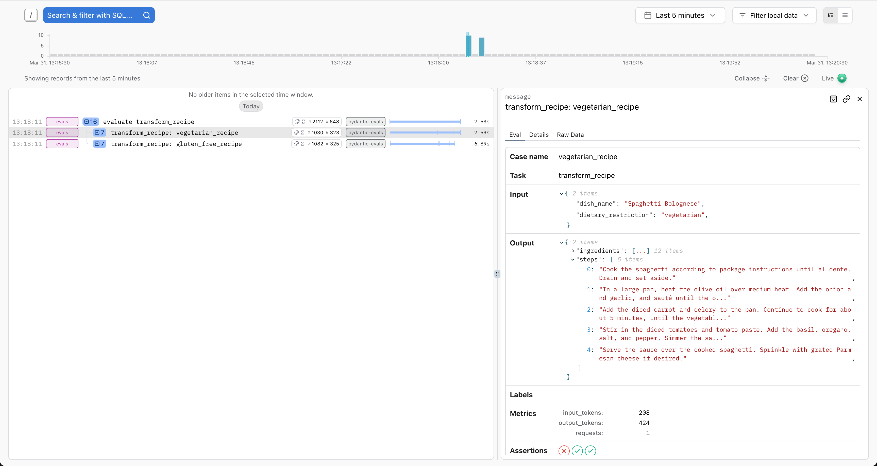 Logfire has some special integration with Pydantic Evals traces, including a table view of the evaluation results